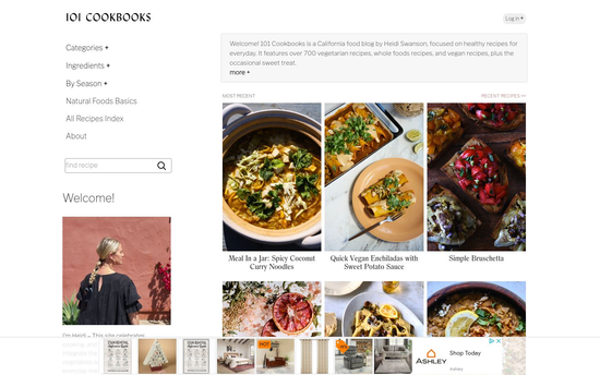 101 Cookbooks is a food blog focused on healthy recipes for everyday. It features over 700 vegetarian recipes, whole foods recipes, and vegan recipes, plus the occasional sweet treat. It is written by New York Times best selling author Heidi Swanson.
